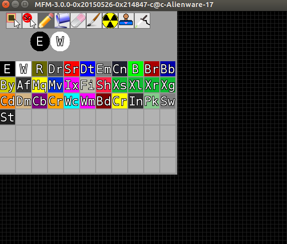 . The colors are elements. The pencil tool is selected by default. We can draw a dot or a line of Atoms of an element use the pencil tool. For short, we will use Atom instead of Atom of an element in the following tutorial. If we want to draw or delete atoms in a big area, we can use the brush or eraser tool. The rightmost button also allow us to change the size of our brush and eraser. We can use two colors at one time. In this screenshot, we can draw back Empty atom with left-clicks, and white Wall atom with the right-clicks.